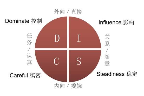其中D指的是Dominance——支配;I指的是Influence——影响;S指的是Steadiness——稳健;C 指的Compliance——谨慎。
